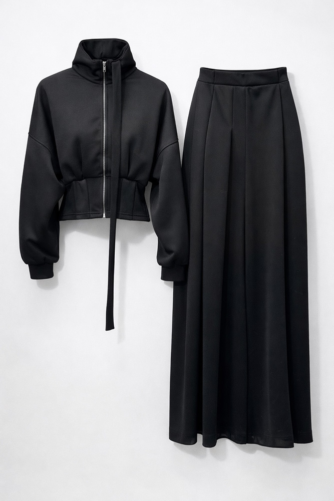 ست زنانه مشکی با طراحی مینیمال و مدرن شامل سویشرت کوتاه زیپ‌دار و شلوار بلند پلیسه‌دار، انتخابی شیک و خاص برای استایل‌های روزمره، خیابانی و نیمه‌رسمی.