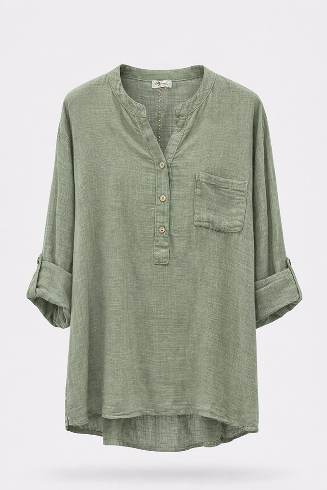 شومیز ایتالیایی با طراحی ساده و مینیمال، مناسب استایلهای روزمره و راحت. پارچه سبک و خنک با فرم آزاد، باعث میشود لباس روی تن رها و خوشفرم باشد. یقه هفت دکمهدار و جیب جلو، ظاهری کاربردی و شیک به شومیز داده است.