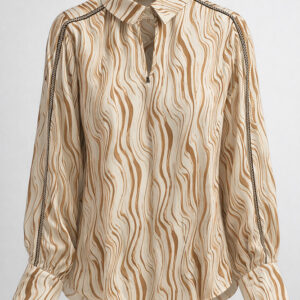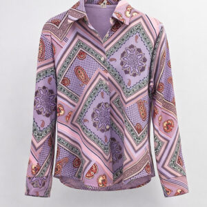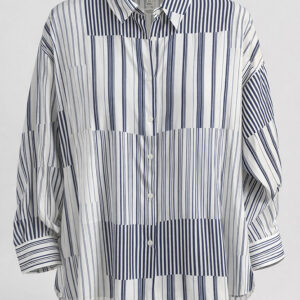 شومیز زنانه شیک با ترکیب راه‌راه‌های عمودی در اندازه‌های مختلف، انتخابی مدرن و خاص برای استایل‌های روزمره و نیمه‌رسمی. طراحی متفاوت این مدل، جلوه‌ای امروزی و جذاب ایجاد می‌کند.